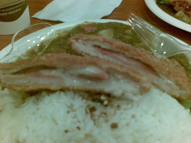 芝士猪排咖喱饭,比较贵的饭而且这个好像晚上不特价也没送饮料,正巧团了代金券,一样不能享受晚上的套餐特价所以就点了这个,是用招牌蓝带猪排配上咖喱的饭。蓝带猪排说实话有点失望,没有想象中的那么好吃,虽然猪排里面加了芝士还放了培根,但是可能猪排炸太过了挺干的,而且咬起来很硬,影响了口感,饭呢软软诺诺的粒粒分明,咖喱的味道也很不错而且还有调味的辣白菜,这个辣白菜挺好吃的脆脆的还很入味酸酸辣辣的,非常的开胃,忍不住多吃了及口饭~~哈哈