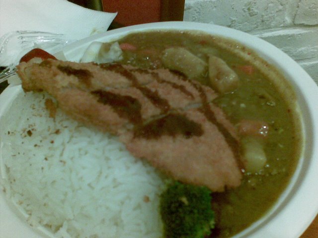 乐乐咖喱腿排饭,绝对的推荐啊~~~鸡腿比那个猪排好吃太多了,外面炸的脆脆的里面很嫩很嫩,咬上去还有汁水那种,而且很细心的都切开了一块块的吃起来也方便。因为晚上特价价格也便宜,红茶,黑茶,绿茶,还有一个茶忘了,四个差选一个,挑了绿茶,很大一杯闻上去味道香香的不错。