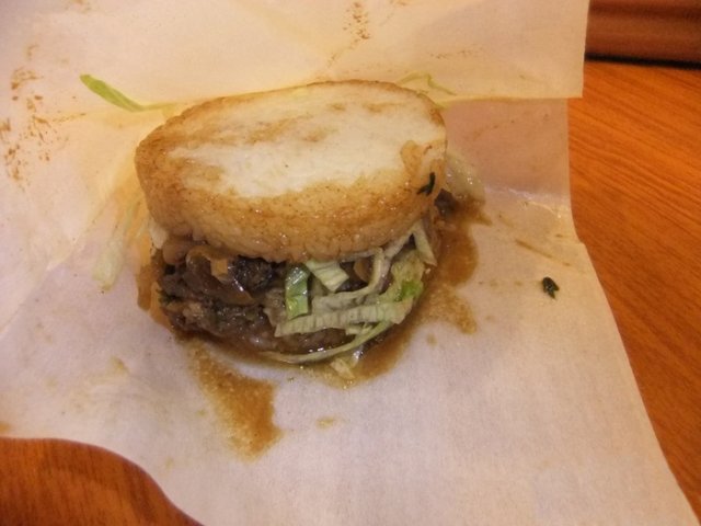 厚切猪乐米堡,这个米堡算得上是这家店的特色了,和普通的汉堡不同把汉堡的两片面包用米饭代替了,不过有点不好的就是米饭不够紧容易边吃边掉不太方便,也不是很雅观,可以改进的话就好了,被米饭夹着的猪排很厚,炸的很香脆,还放了洋葱生菜等配料,一口咬下去还有汁水,可见猪排是炸得香脆嫩滑,口感绝佳~~回味无穷啊。