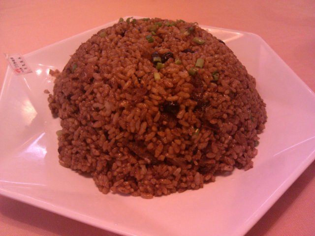 豆豉鲮鱼炒饭,装在一个大白盘里上桌的,看着很一般,量不是很大。里面的鲮鱼不是很多,偶尔能吃到几块,很劲道,豆豉的味道很香浓,米饭粒粒分明,咸淡稍重了些,配着菜吃会觉得有些咸,单独吃还可以吧。