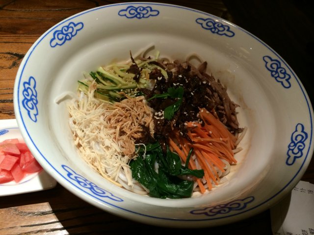 【鸡丝凉米线】 点击率挺高的一道菜, 反正周围的桌差不多都点了。 很喜欢这道鸡丝凉米线, 甜味适中, 非常爽口, 很适合夏天吃, 没哟了过桥米线的油腻。