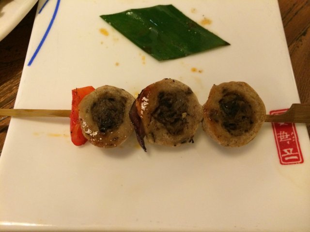 【菌菇串】 这个没什么特点, 其实就是鱼丸里面包了一些剁碎的菌菇, 口感和福州鱼丸很接近。