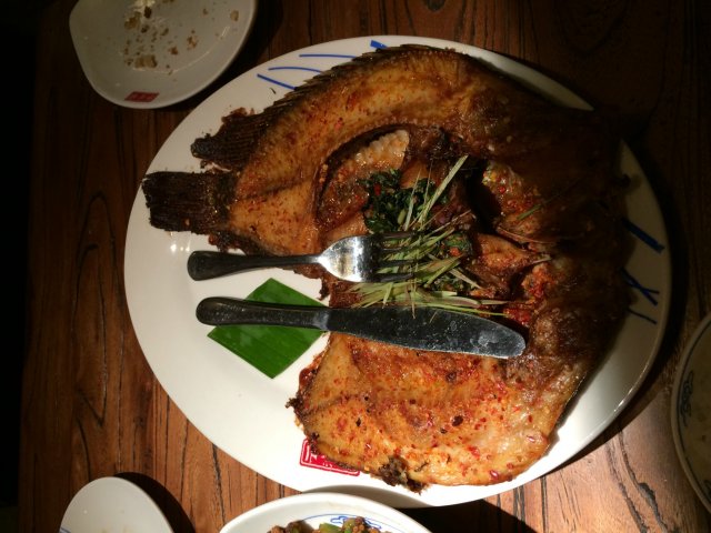 【香茅草捆鱼】每次吃他们家的这道菜, 总会疑惑, 为什么鱼肉不是对称的呢。 不过不得不承认这道菜吃过的几家云南菜馆里做得最好吃的, 调料放的挺多, 肉也很嫩, 应该是比较新鲜的,味道很赞。