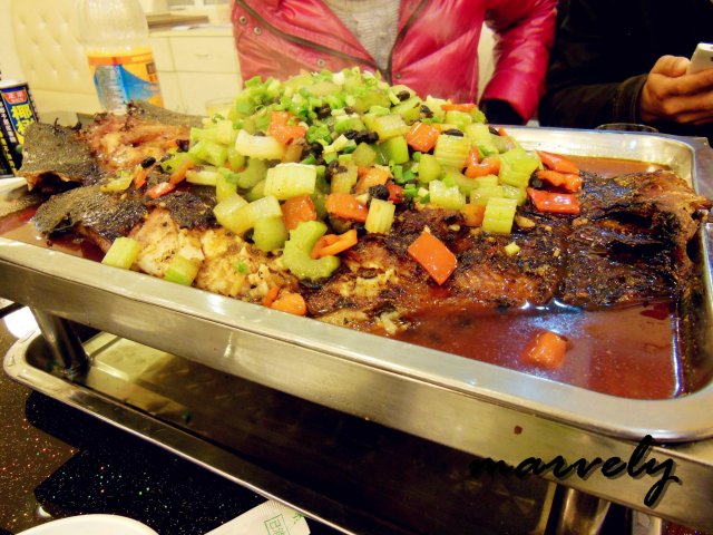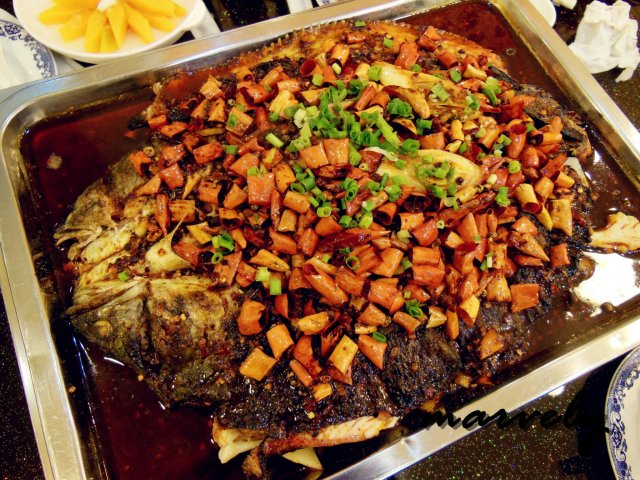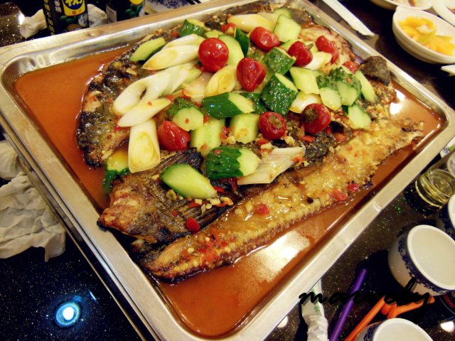 鱼香口味的烤鱼,大概是专门为了上海人开发出来的,既有川菜鱼香传统味道的香辣,又有上海习惯的甜味。清江鱼是烤鱼中鱼肉比较嫩的一种,的确吃在嘴里的感觉很细嫩。不过我个人对这个鱼香味不是很喜欢,总觉得鱼香用来炒肉丝还不错,可是用作在烤鱼上,味道似乎就不那么纯粹了。