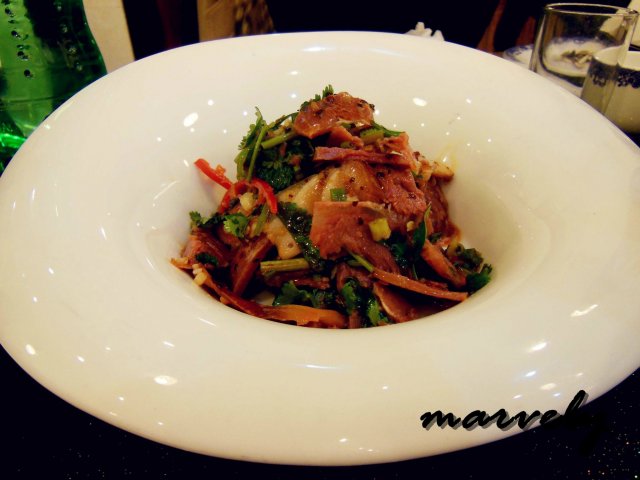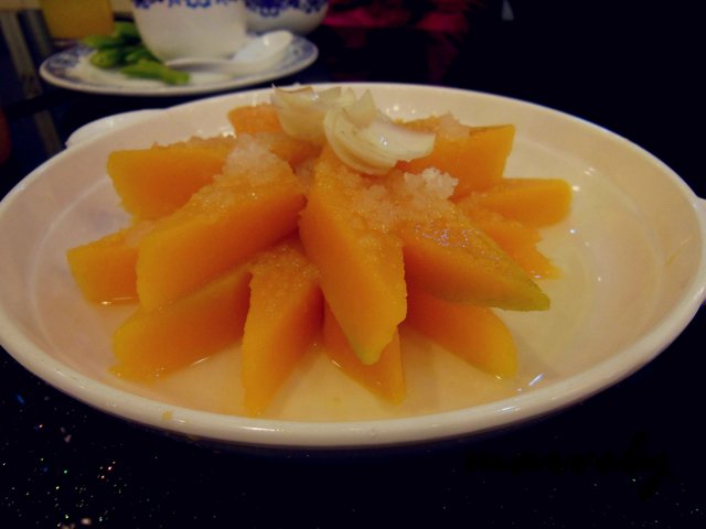 这道前菜我很喜欢,是因为上面的百合。店家用的是生的百合,事先应该是冰冻过吧,吃在嘴里的感觉又脆又清凉。下面的南瓜并没有被煮到很烂的,而是稍微有一点质感,加上白糖的辅助,甜甜的。