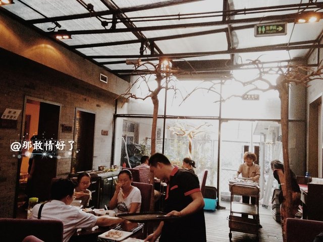 环境上真是别有洞天,很老的门帘,进去也是,再往进走像窑洞,石头的一圈围起来。再往里走时尚些了,还有树木,甚至像泡菜国咖啡馆。一般人都集中在这个区域就餐,也有很大的包房可以聚餐、