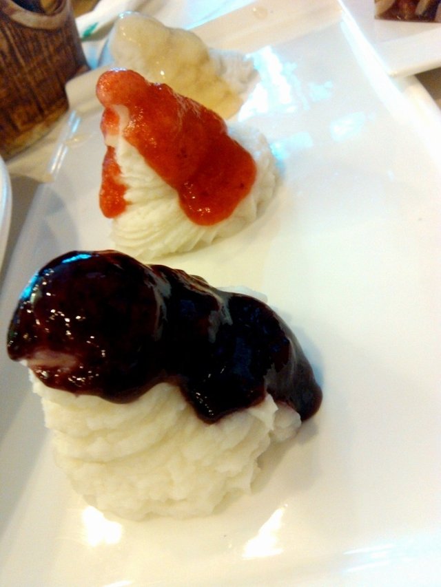 三色果味山药,山药本身没有突出味道,制成口感细化的山药泥,分别淋上蓝莓、草莓和香橙三种果酱,甜糯合口,既可以作为爽口开胃小凉菜,也能作为餐后甜品