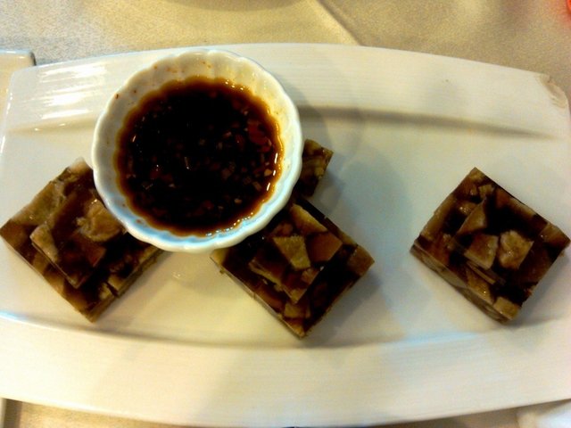 脆骨冻,其实就是肉皮冻,反正我是没吃到脆骨,他家的猪皮处理得非常干净,不带一点儿肥肉,而且皮冻比较软,稍微使劲夹易碎,入口很爽滑,不用嚼就会慢慢化在嘴里,与那种Q弹口感的皮冻各有千秋。不蘸汁也没问题,看个人口味了。