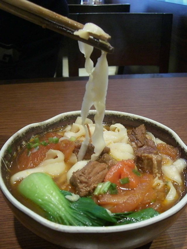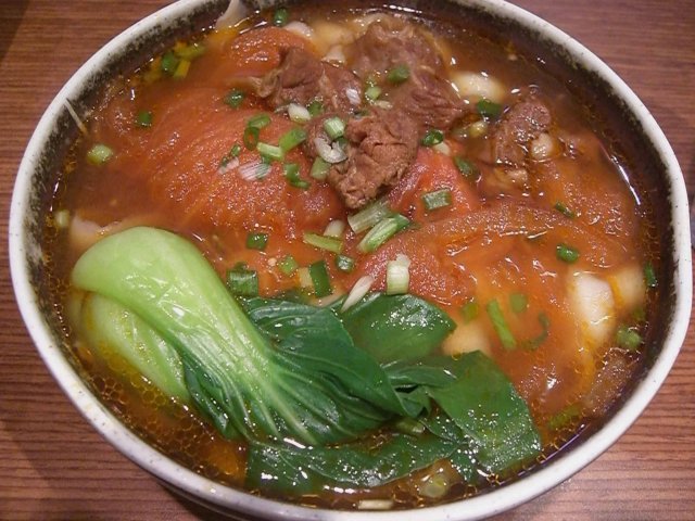 小份削面被满满的番茄卤汁覆盖着,连面带汤的也有一大碗,四五块牛肉、一棵小油菜,红绿搭配挺刺激食欲,面条很筋道儿~