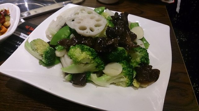 炒菜的种类略少,点了个西兰花木耳莲藕的青菜配搭,和这种重口味的麻辣香锅配着吃刚刚好。