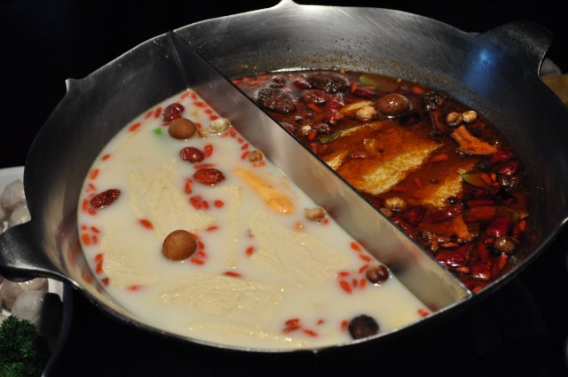 红汤是香辣锅底,用各种中药材加高汤熬制而成,吃了也不会上火的,香辣味恰到好处。