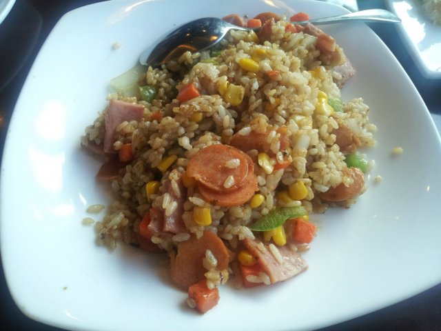 【巴伐利亚风味香肠炒饭】:26元。这款炒饭吃起油有点重,味道的话,是有点带酸甜口感的鱼香酱的感觉。刚吃几口的时候有点奇奇怪怪,适应了之后还是觉得可以,但是也不能算是好吃。而且这也是一款肉多的炒饭,除了切成片的烟熏烤肠,还有切成块的培根肉,虽然也搭配着玉米粒和胡萝卜粒,但是总的来说还是偏油腻了。