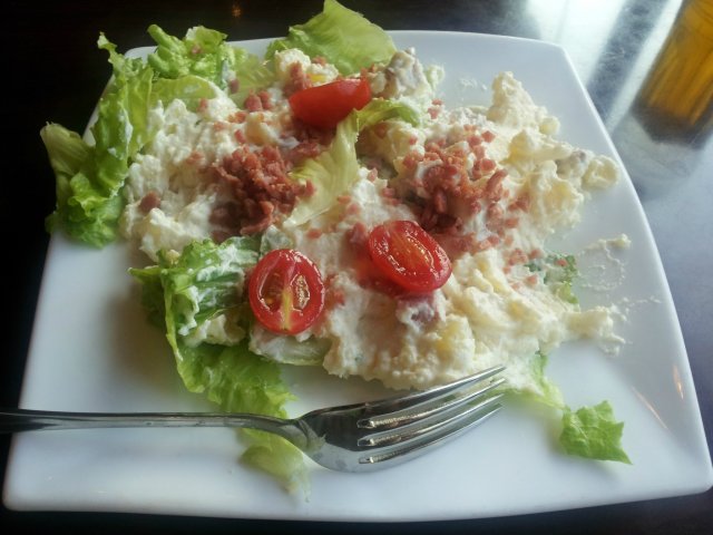 【美式经典土豆沙拉】:18元。土豆沙拉是火柴棍要求点的,端上来之后,应该是装盘没弄好的原因,沙拉酱乱七八糟的撒落在盘子里,卖相有点糟糕。最下面是一层生菜叶子铺底,生菜上面的土豆不是压成土豆泥的那种,而是口感很硬的土豆块,不过沙拉酱裹的还算均匀。最上面撒了一些火腿粒和装饰的小番茄。总的来说,这道沙拉吃起有点扎实,不过腻的很。还是觉得最正常的那种纯蔬菜沙拉,清清爽爽的更好吃些。