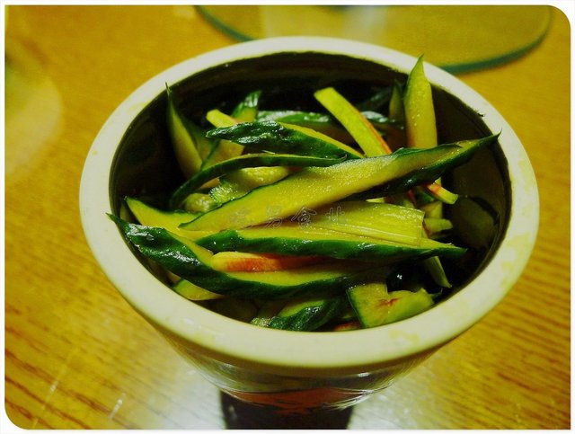 菜根香,21元,精巧的小缸容器,盛方了切成粗丝的黄瓜和萝卜,经过调制的蔬菜,有着更深入的味道。