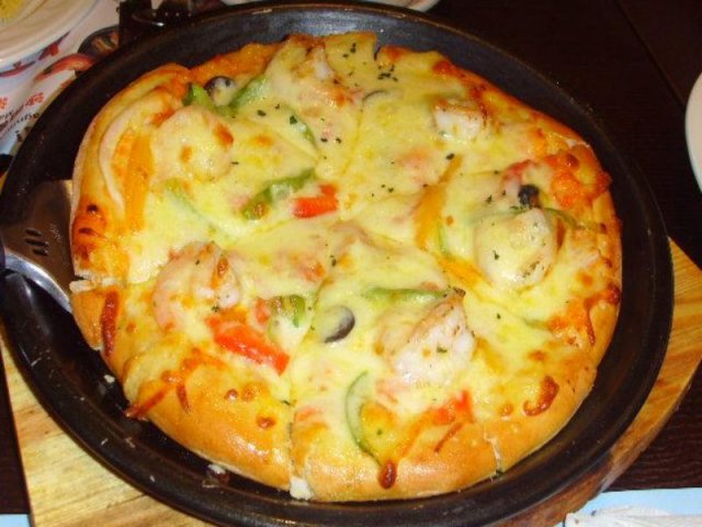 洋葱圈,还有至尊大虾匹萨(★★★☆个人感觉:洋葱圈不怎么样,PIZZA上的CHEESE拉的好长好长,感觉像DOUBLE CHEESE,但口感上CHEESE味不重,中规中矩,我还是喜欢是DOMINO PIZZA)
