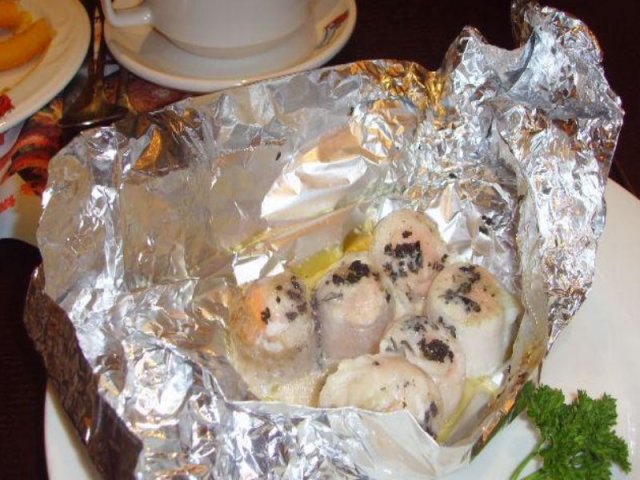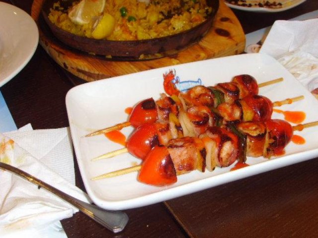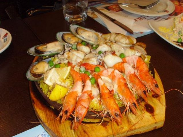 海鲜大烤盘:(个人感觉:★★★★上面的青蛤有些腥,虾很新鲜,很不错,小鱿鱼很嫩,鱼块很软,下面的米饭稍微有些干,相对偏了点硬,有点risotto的感觉,总体感觉适合情侣两个人去吃,还是蛮划算的)