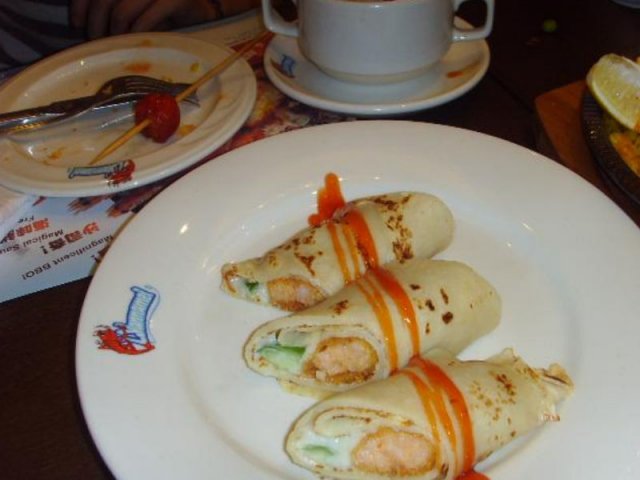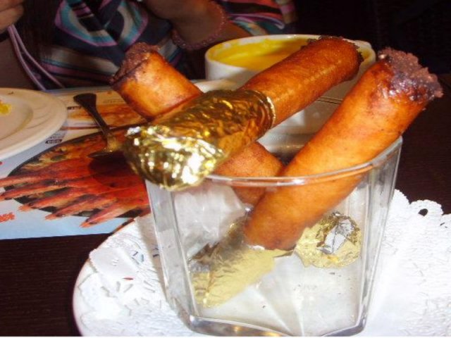 杜夫雪茄虾:(个人评价:★★★★★个人很喜欢这个菜,外皮脆脆的,里面的虾很新鲜润滑,很Q,而且CHEESE很饱满,我吃到的一整条里面全是虾与CHEESE,但有个别同学就好像虾不是很多的样子,难道这也是随机的???而且我也猜到顶尖处就是传说中的肉桂粉,嘿嘿)