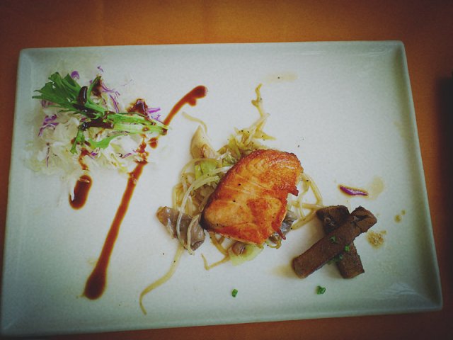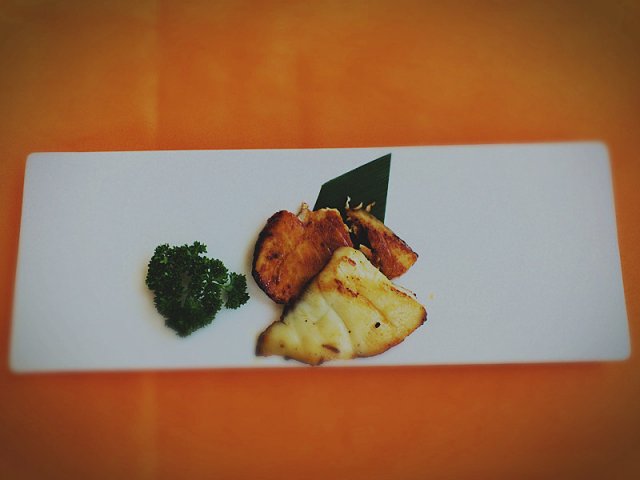 接下来一道菜是烤鱼,一个是鳕鱼,还有一个好像是金枪鱼吧,都烤得稍微偏老了,感觉肉质就不是那么鲜嫩了,这道菜有点小瑕疵。