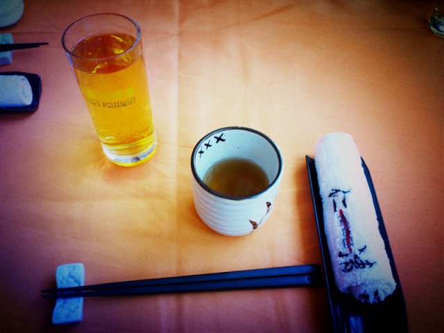 由于不赶时间,所以选择了整套怀石料理,因此开始了漫长的等待。这款真的就适合不赶的人,因为是一道道上的,而且间隔时间特别长,没一个小时绝对吃不完。落座后就先上了茶和啤酒,啤酒好像是能续杯的。
