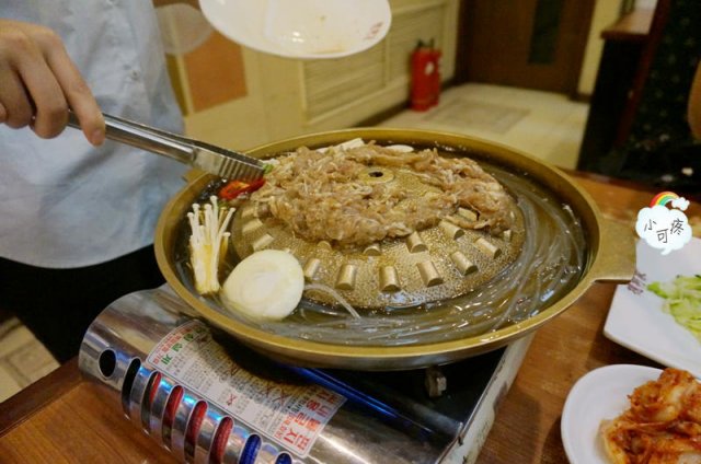 偶们点的烤牛肉粉丝。这个烤锅很有趣。肉片放在凸起的烤盘上烤制,旁边凹处放有汤汁,粉丝和金针菇就煮在汤里。牛肉略烤熟后就放进汤里一起煮既吸收了汤汁的味道又不会烤老。。这个烤肉蘸着黄酱裹着生菜一起吃也很不错哦。