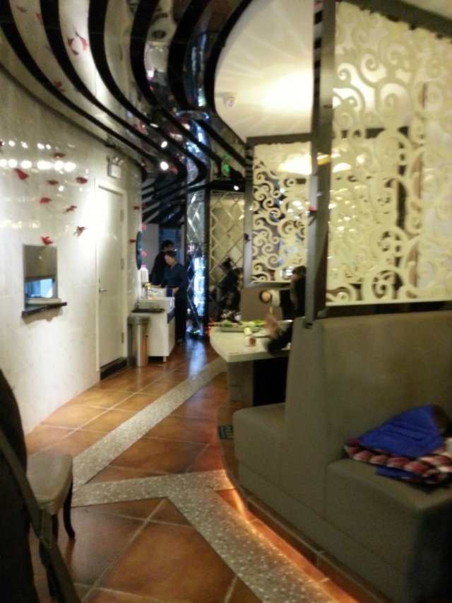 室内布置的的很温馨,灯光柔和,很有情调,尤其是卡座,隐私性很好,沙发座椅坐着也很舒服,桌子足够大,吃饭很是方便。