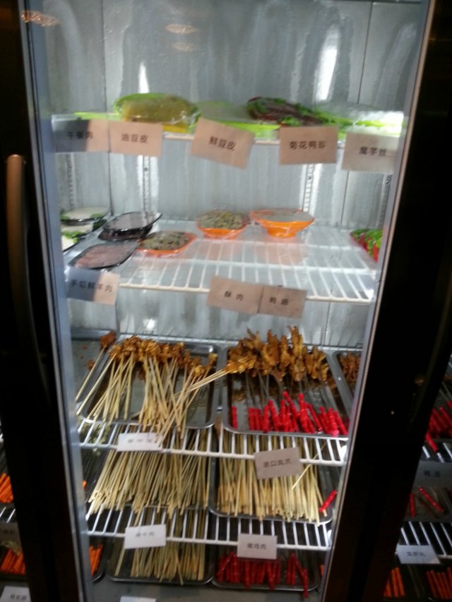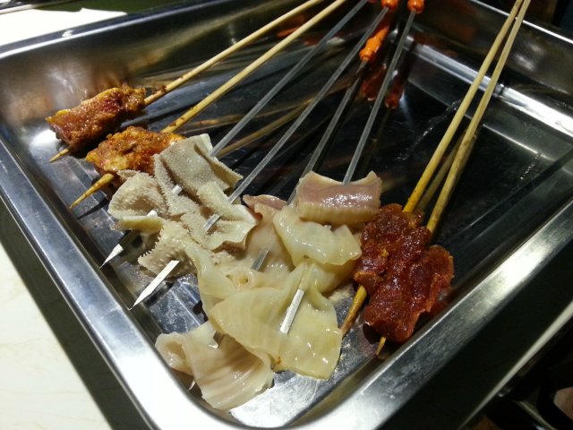 各种的串,钎子很长,钎子把颜色不用,用以来区分价格。食材都是集中串在钎子的一头,这样钎子可以直接放在火锅里,煮好后拿出来很是方便。