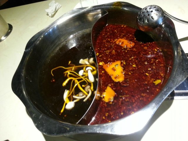 鸳鸯锅,一半麻辣,一半菌菇的。