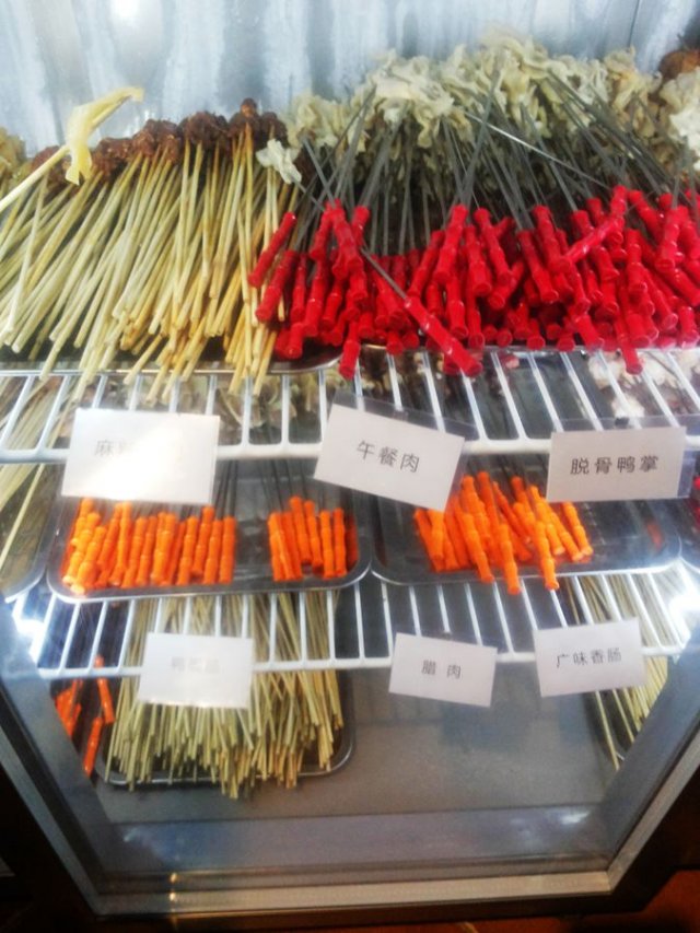 真没想到,三里屯这个西式风格的地方,居然开了串串店,装修很西式,黑色的基调,有吃串串火锅的感觉,作为是黄色的,看着比较温馨,比较有特色的是串串的展柜,里面各种颜色的签子,很有特色,价格不同。还有成盘的,也是盘子不同,价格不同,像寿司…… 至于价格,到是不贵,从1元,1块5的,三元的,5元的都有,不过1元的居多,我拿了喜欢的面筋,油条,蘑菇,丸子,还有盘装的虾滑,龙利鱼,皮皮虾,喝的是酸奶。要的番茄锅底,是服务员推荐的,那个小伙子很腼腆,推荐的不错,哈哈。