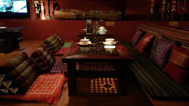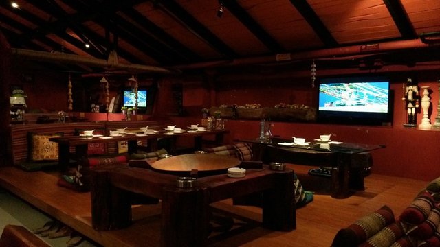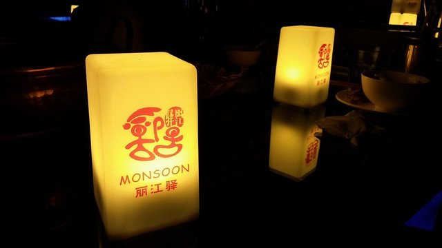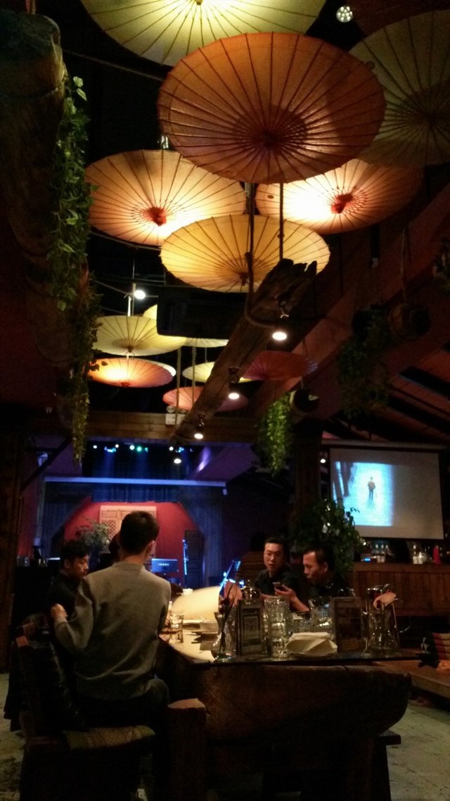 餐厅顶部悬挂着五颜六色的油纸伞,整体格调仿佛让人置身于云南丽江——古朴、纯正、优雅。
