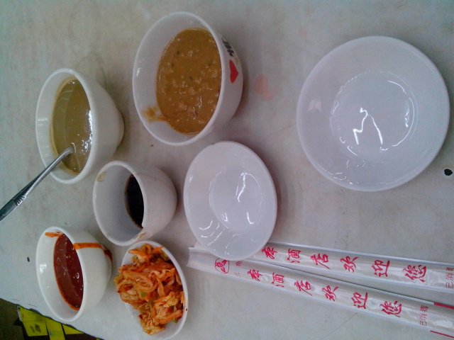 :)这家给了一小碟类似辣白菜的小凉菜,味道很不咋地。还给了四种调料,黑乎乎类似酱油那个我俩都没尝试,主要吃的还是麻酱和辣酱,我觉得辣酱味道倒是还不错。吃起来是甜辣味道的,配合烤肉灰常合适啊!