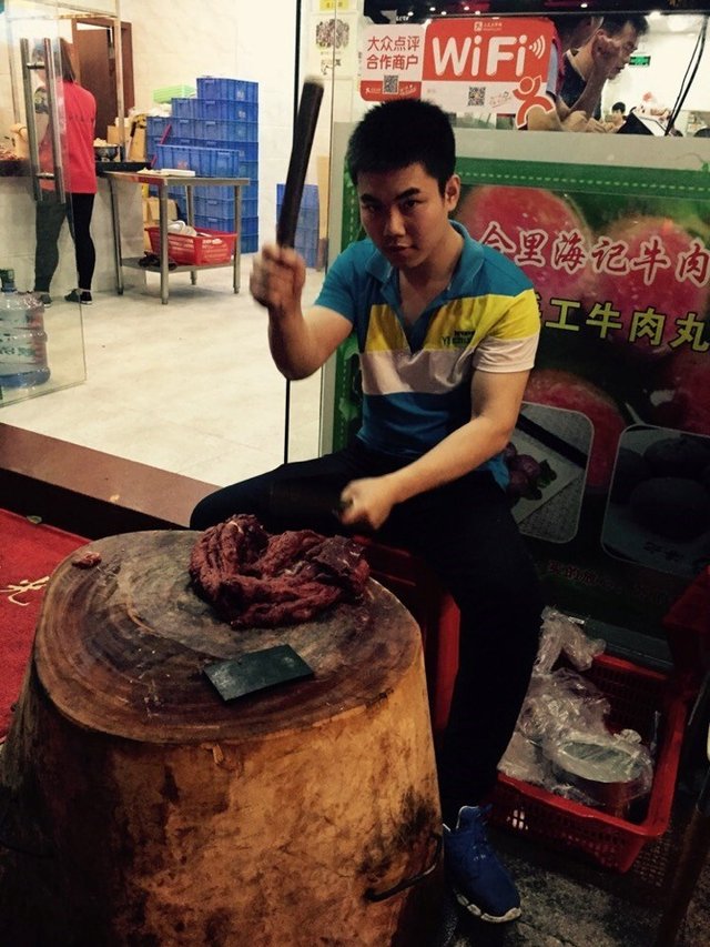 门口有个小哥在演示手打牛肉丸..姿势很不错。感觉很使劲.