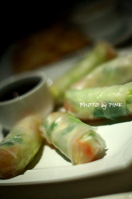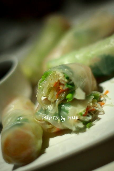 Spring Rolls:超级小清新风格的素春卷,用越南春卷皮裹着黄瓜,胡萝卜,粉丝,罗勒叶等,若隐若现的嫩绿色很漂亮,边上配的特调酱汁味道很鲜。