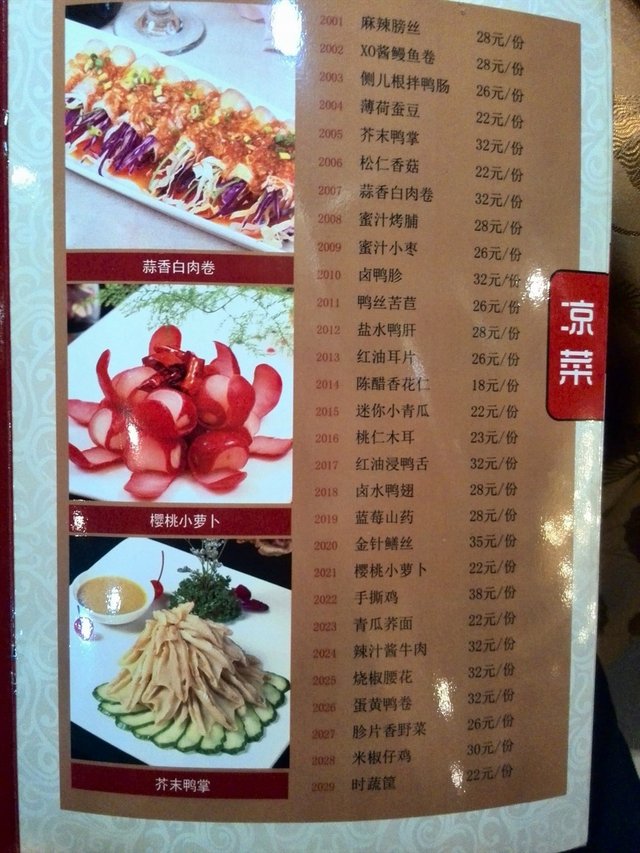 鸭子是一整只推出来然后当着你的面切片的.切鸭子时,服务员会问你,要片成皮肉分离还是不分离的那种.我觉得不分离的要稍微好点,不会那么油腻.其他菜品摆盘也不错