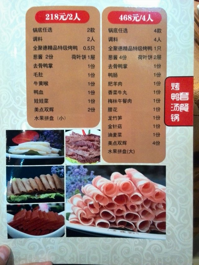 烤鸭色泽红艳,肉质细嫩,味道醇厚,肥而不腻,最近全聚德推出了汤锅系列.有各种口味.我选的是酸辣开胃汤的口味.感觉很不错,吃了一下旁边会员的汤.感觉都木有我的好吃诶
