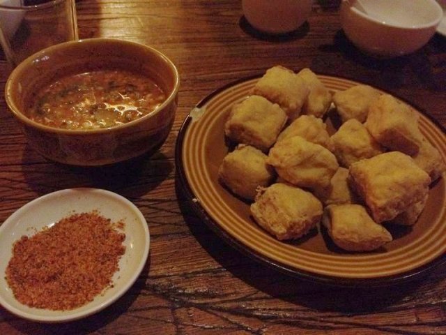 这个是油炸臭豆腐,另外的两个小碗里是蘸料,要把他们混合起来,蘸汁吃。