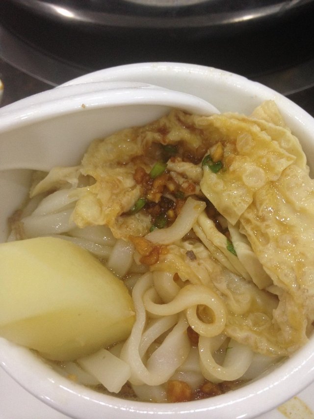 吃那么多肉,还点了份土豆,腐竹和粿条,自己下锅煮,再倒些酱油蒜蓉,感觉吸收了汤底的精华,不错。埋单用团购券最划算。