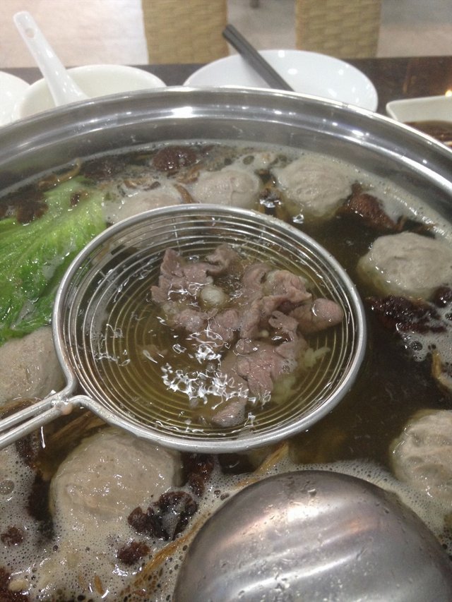 吊龙伴,应该是靠近筋的部分,肉带些筋,烫熟的感觉是爽脆的,口感比较特别;三花趾我个人最推荐,因为即使烫了很久,肉依旧软嫩,而且还带些肉脂的香味,感觉有点想肥牛,但又比肥牛更有肉的感觉;匙柄 比较普通,也许是全瘦肉的关系,烫久会柴,牛肉味道不如前两者。肉类推荐蘸酱油,更能突出肉的鲜甜。
