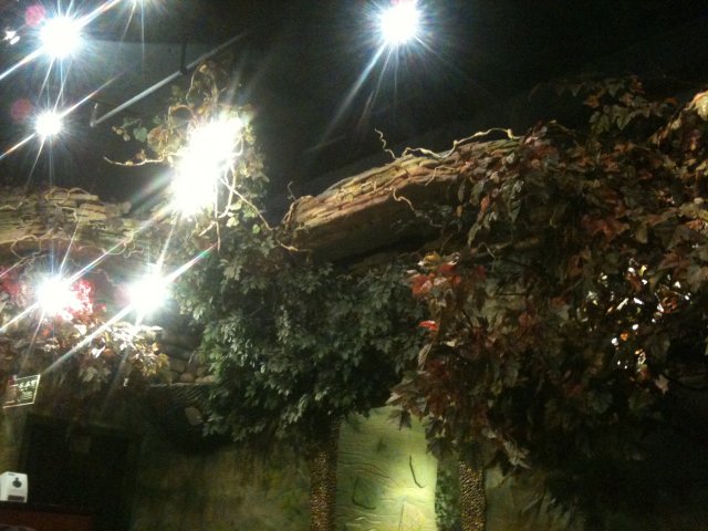 店里的环境还不错,装饰的蛮有意思的,各种树枝、叶子围绕在墙上、房顶上,我总觉得跟水帘洞似的,光看装饰完全想不到他家是吃什么的。因为人太多,桌椅比较多,很容易被碰到。