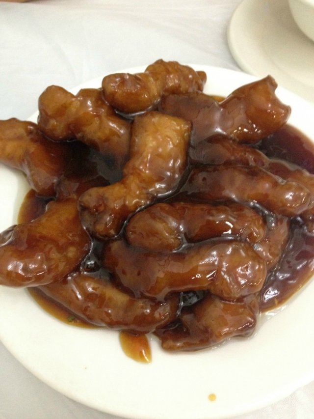 这家店开在嵩山路107号离淮海路不算很远,地段非常好,吃饭的人很多,但是店面真心的小,也就只能容下7张台子,吃饭的地方蛮小的。这家店是一对夫妻经营的小店,本帮菜的味道的确是很好。点了糖醋排条26元,排条的量蛮多的,糖醋的味道很浓郁,酱汁拌饭都很好吃,排条很实在没有裹很多面粉,很推荐的。招牌的鸡骨酱蛮咸的,浓油赤酱很下饭,味道也不错也是26元。点了个素菜腐乳空心菜,也是他们家的招牌菜,空心菜很新鲜,炒的脆脆的很好吃,搭配腐乳酱蛮鲜的,就是吃到底下的时候有点油了。2个人3个菜再叫2碗饭就足够了,我们总共花了72,还是蛮经济实惠的,值得推荐的一家小店,真心的不错。