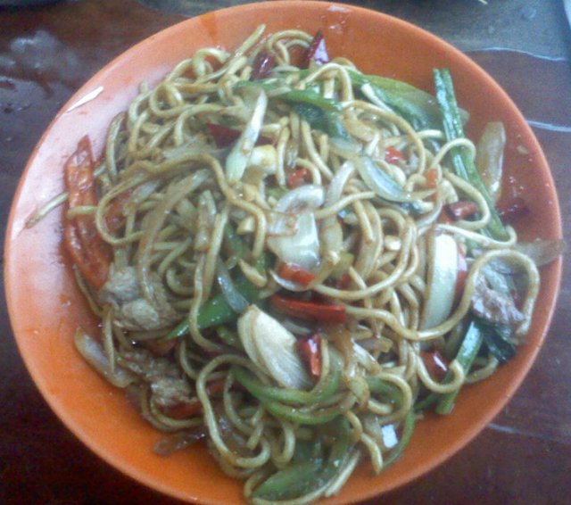 第一次来这家吃爆炒面,味道还不错,里面有青菜、青椒、洋葱和肉片,面条比较劲道,分量十足,吃了很久才吃完,挺饱的。