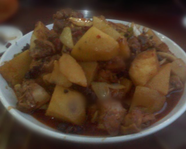 我们四个人,一共要了几十串烧烤,还每人要了一份炒面。吃到最后才上来这个小盘鸡,已经很久没有吃过小盘鸡了,最近一次吃,还是在长沙时候。这里面主要是土豆、鸡块和面条。这里的土豆比较松软,因为做的时间比较长,土豆比较入味,吃起来比较辣。鸡块不算少,不过到最后大家都吃饱了,这份小盘鸡没怎么吃,可惜了。下边的面条跟以前吃过的小盘鸡不一样,我只吃了一根,没有以前好吃。