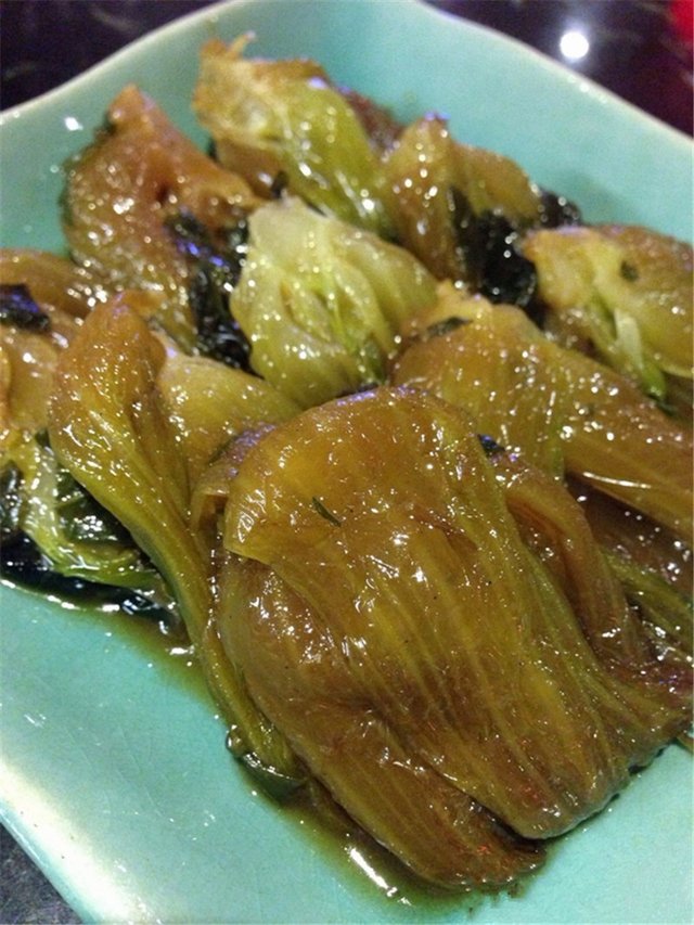 一道凉菜,用油菜酱烧出来的,浓油赤酱,吃起来有点像四喜烤麸的味道。