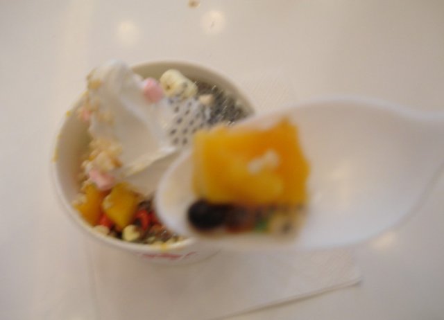 我选择的是棉花糖+巧克力珠+少许芒果+杏仁+的组合,棉花糖的口感很软软的。而且酸奶的口味和巧克力的口感相互融合,交融的比例和恰当。