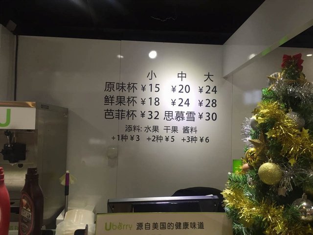 「味道」冻酸奶价格相对较贵,因为纯天然无添加,绝对健康,跟普通的冰淇淋不同,而他们家的冻酸奶也比hey yo喜乳酪便宜些,原味小份15元,中份20元,大份24元,价格跟dq差不多,就是比dq的少~原味的冻酸奶就是酸奶味十足,做成冰淇淋入口即化,最重要的是,让广大爱美女性可以不用担心卡路里过高而少吃到美味,同时他们家也可以加各种干果水果之类的,每份价格3元,价格适中~