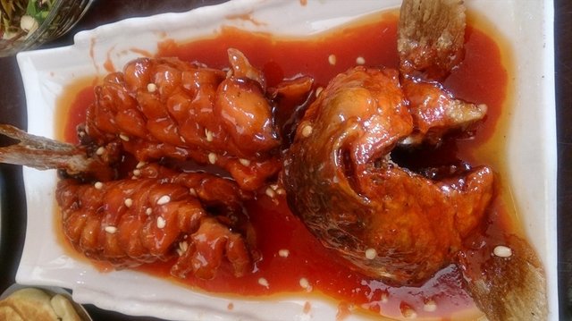 松鼠鱼,就是炸一下然后浇汁的,倒是松鼠鱼的正经做法,不过味道一般,汁有点太甜了。