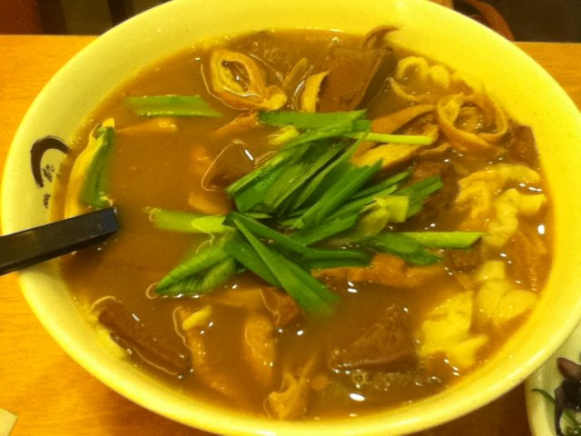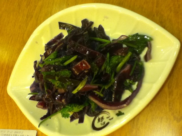 中午去的,到那边差不多1点吧,没啥人,直接入座。尝了秘制大肠猪血面30米,处理的算还不错。温州肉排面30米,三块肉排,面条q度可以,汤头蛮浓的,不知道是炖出来的还是压缩出来的,自从味千事件后,什么都辨别不出来了。不过两种面条的汤头吃起来一样的。两份主食送一份小食,选的紫球菜拌海蜇,其实就是紫甘蓝,这道菜但是蛮惊艳的,很爽口,不过海蜇把紫甘蓝的颜色都染上去的,也是紫色滴~~总体来说他们家面条味道还不错,小贵~~~