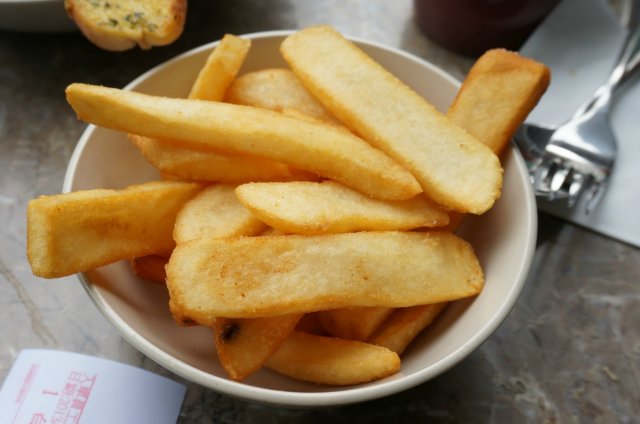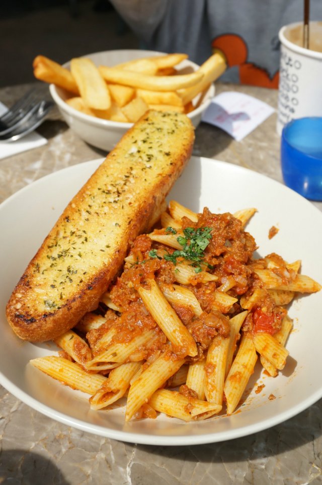 罗勒洋葱番茄肉酱意粉+炸薯条+白咖啡,93元。