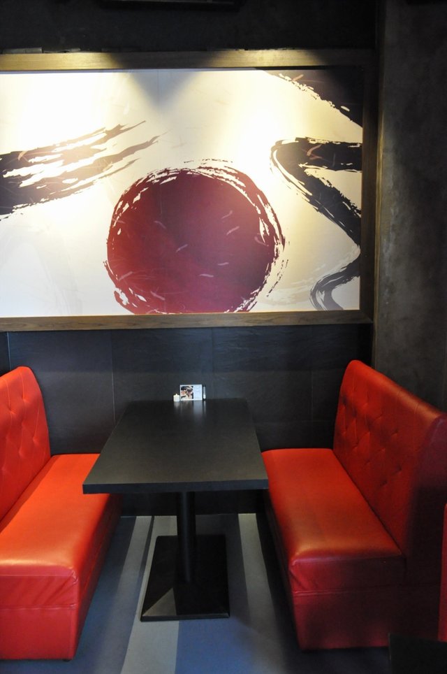 很酷的环境,黑色的主色调,黑墙、黑桌,配红色的沙发椅。