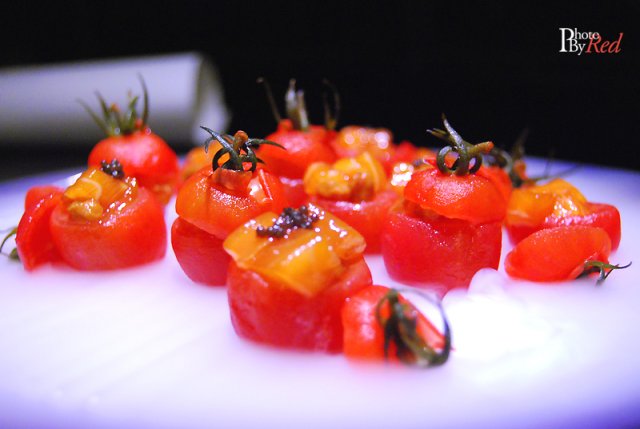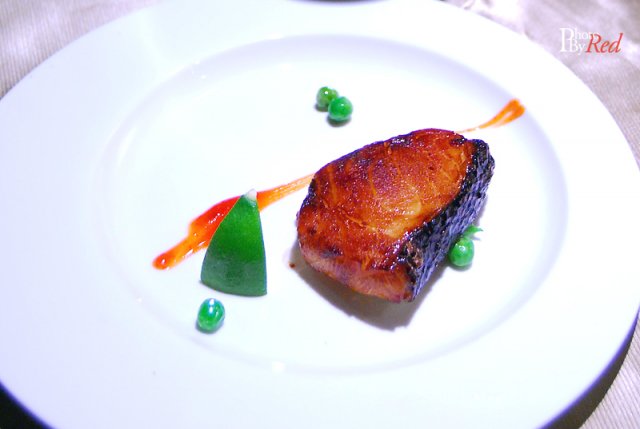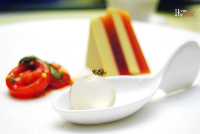 菜品玩的是创意和混搭,冷菜基本上都是做分子料理,烟雾缭绕的红番茄鲑鱼色拉,造型可爱,口味佳。烟熏鹅肝鱼子酱,鹅肝用玻璃罩罩着,打开是有神奇烟雾飘出,并伴着浓重烟熏味。鹅肝与山楂糕相结合,可能是为了去腥,但山楂的酸味过于过重,掩盖了鹅肝原本的味道。好在边上的鱼子酱给了不小惊喜。