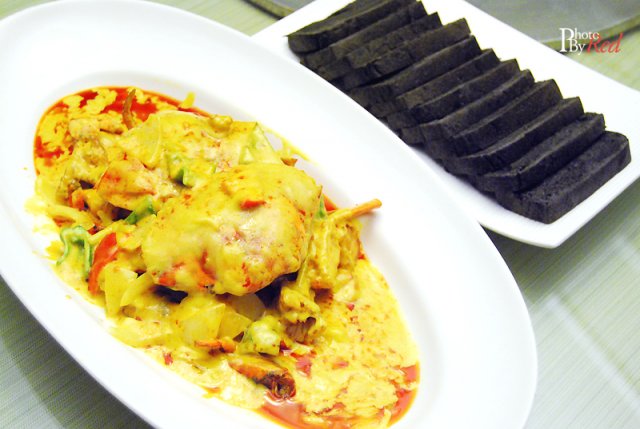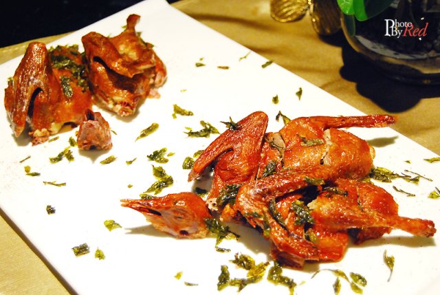 咖喱膏蟹竹炭包,蟹肉肥美,蟹盖里满满的都是蟹黄,搭配的竹炭面包颇具特色,有淡淡的蒜香味,松软不黏牙,蘸着咖喱酱汁很好吃。妙手龙井茶香鸽,外型和烤乳鸽相似,但口感上还有略有区别,加了龙井茶之后倒也别有一番风味。普罗旺斯银鳕鱼,有点像西餐里的主食,上桌时焦香扑鼻,呈金黄色甚是诱人,切一块入口,表层微脆,鱼肉细嫩鲜甜,回味无穷。